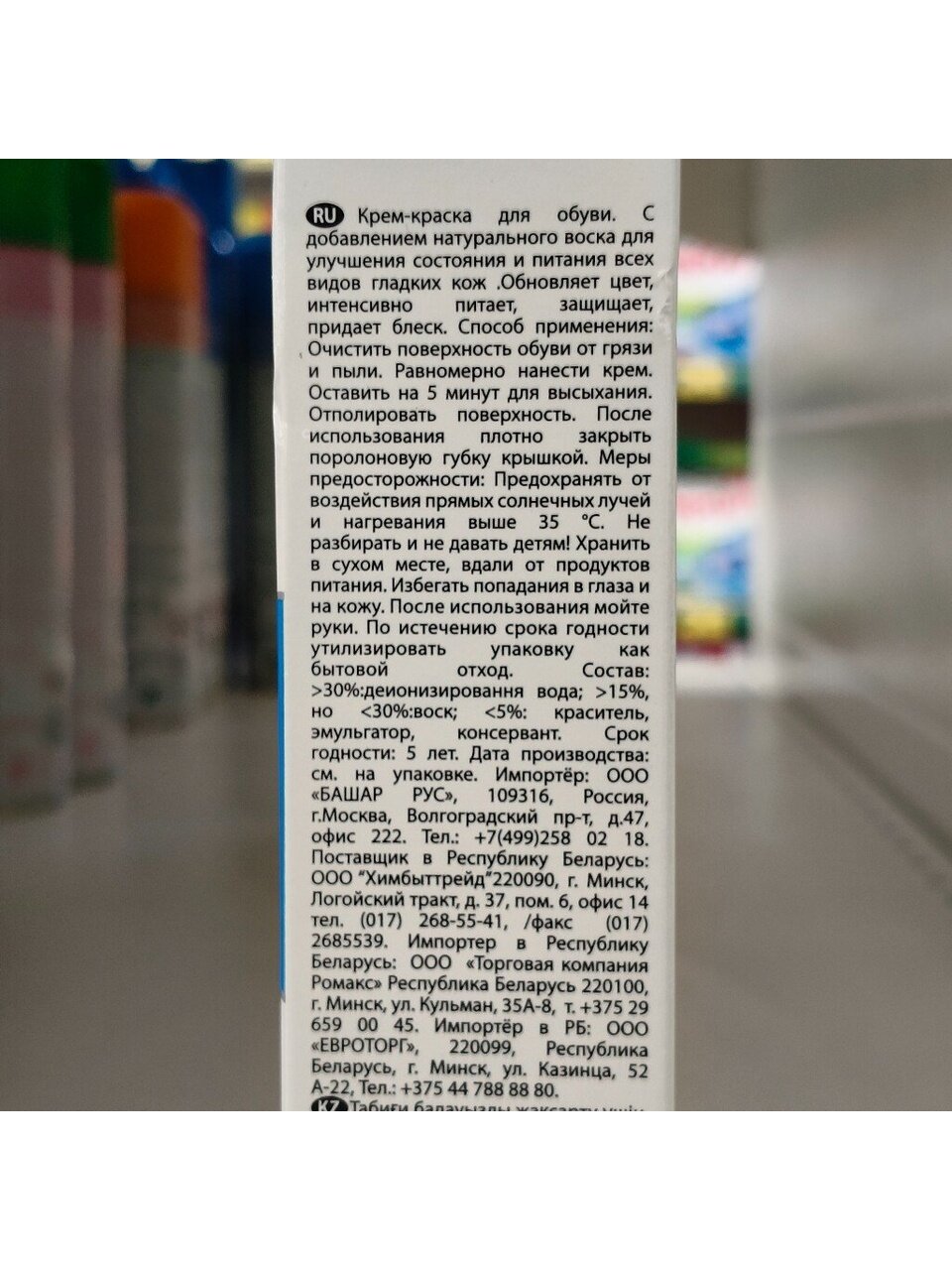 Крем-краска для спортивной обуви обладает высоко закрашивающей способностью благодаря содержанию концентрированной краски черного цвета. Придает яркость спортивной и повседневной обуви из всех видов кожи, винила и ткани. Эффективно закрашивает потертости и мелкие царапины. Чистит, защищает и ухаживает за изделиями из кожи. Увлажняет, придает коже эластичность и мягкость.