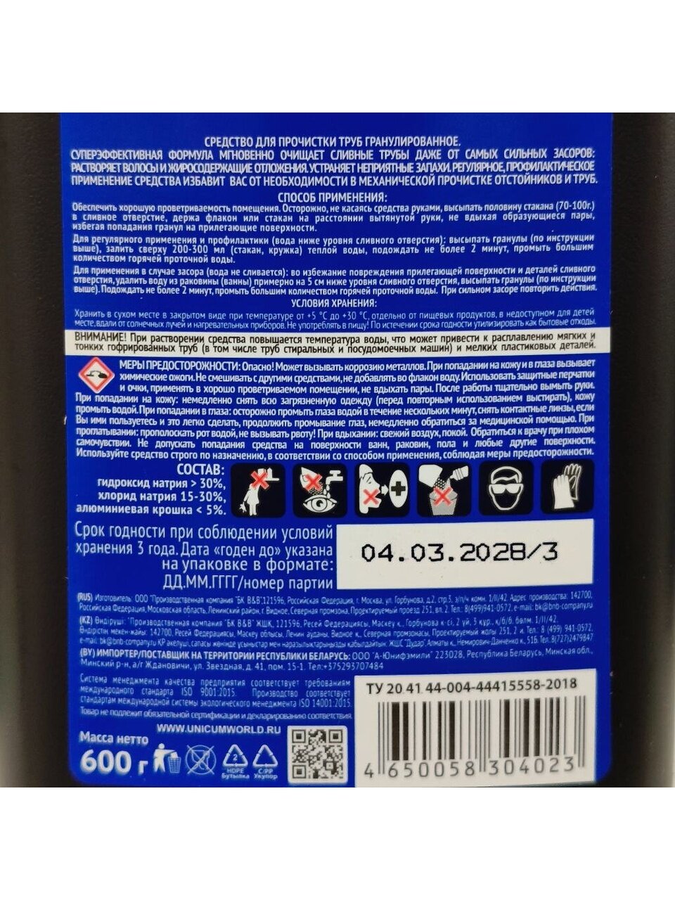 Применение: удалить воду из раковины (ванны) примерно на 5 см ниже уровня сливного отверстия. Обеспечить хорошую проветриваемость помещения. Осторожно насыпать 70-100 г средства в сливное отверстие, держа бутылку на вытянутой руке. Подождать не более 3 минут и промыть трубу теплой проточной водой. При сильном засоре повторить действие.