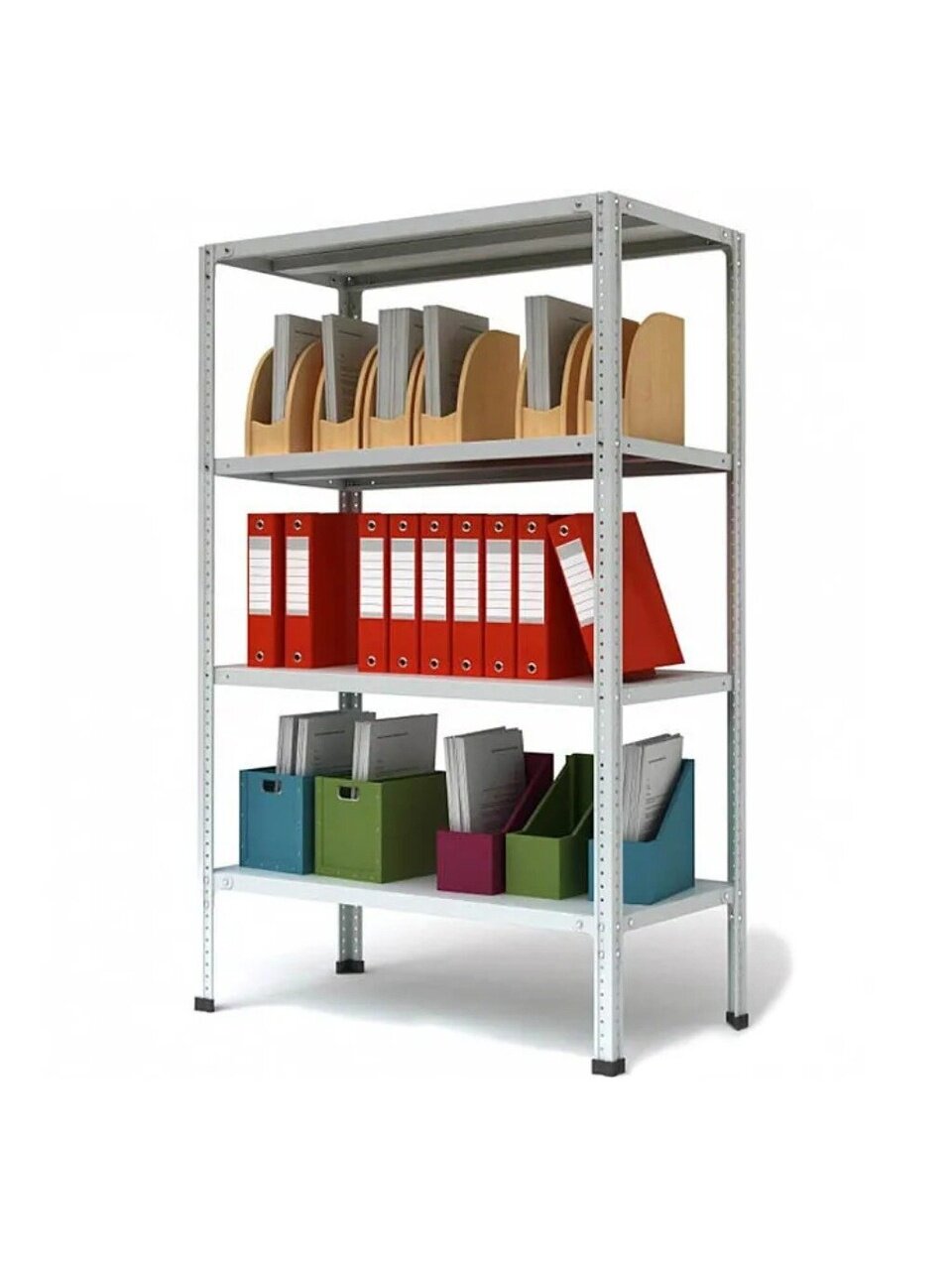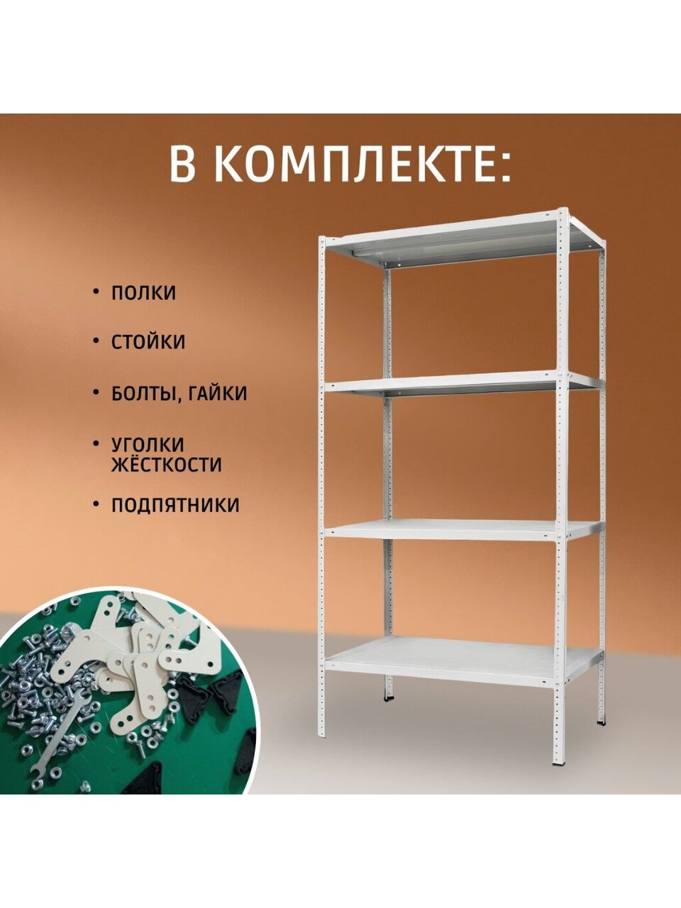 Стеллаж поставляется в разобранном виде и укомплектован 4-мя металлическими стойками, 4-мя металлическими полками и необходимым крепежом для сборки.