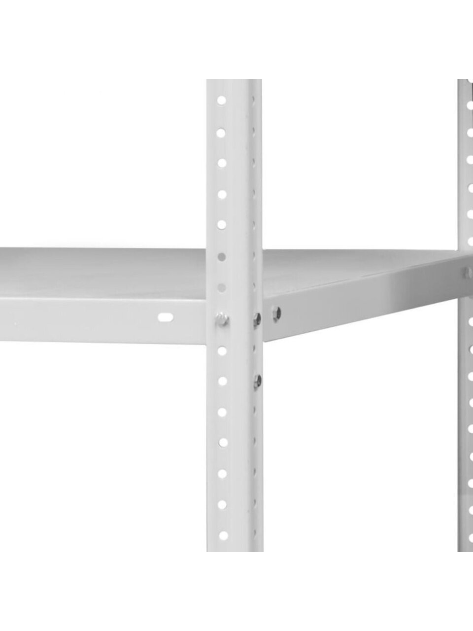 Металлический стеллаж выполнен из стальных материалов высокого качества. Поверхность конструктивных элементов стеллажа покрыта порошковой краской светло-серого цвета. Имеет дополнительные ребра жесткости.