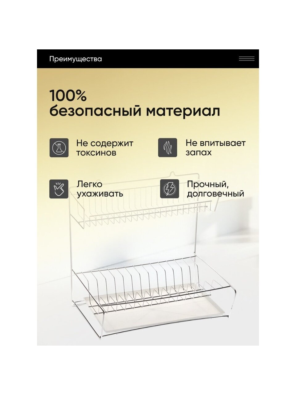 Чем отличается эта модель от аналогов? Она не раздвижная, что делает конструкцию более устойчивой и долговечной. Хромированная поверхность легко очищается, не теряет внешний вид со временем. Часто спрашивают, подходит ли сушилка для посуды для маленькой кухни: да, её размеры оптимальны для ограниченного пространства, а сборка не требует специальных инструментов. Как использовать сушилку? Просто разместите её рядом с мойкой или на стене, и вода будет стекать в поддон, сохраняя чистоту.
