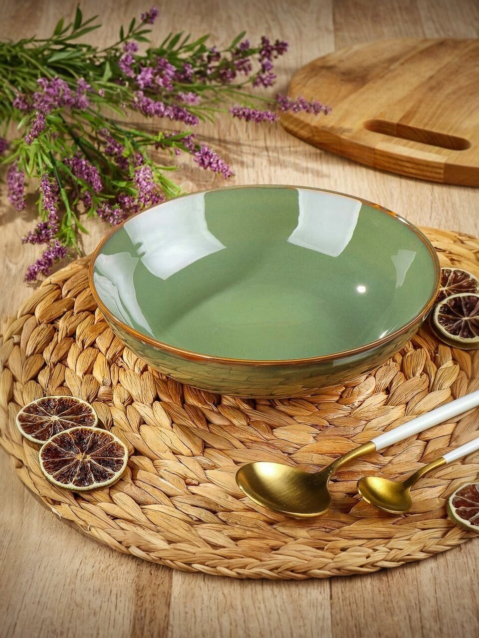 Суповая тарелка Daniks Verde — это прочная круглая керамика с объемом 950 мл и диаметром 20 см. Она отлично подходит для ежедневного использования: глубокая форма удерживает жидкость, а натуральный материал долго сохраняет тепло блюда. Благодаря универсальному дизайну без рисунка и трендовому зеленому цвету, тарелка гармонично впишется в любой интерьер кухни или столовой.