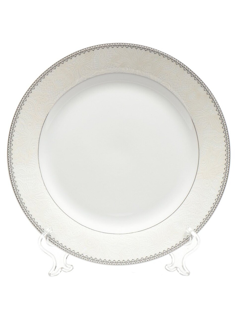 Тарелка фарфоровая Fioretta Harmony 25 см — элегантное решение для сервировки стола: изысканный орнамент, золотая кайма, универсальный размер. Для дома, дачи и подарка.