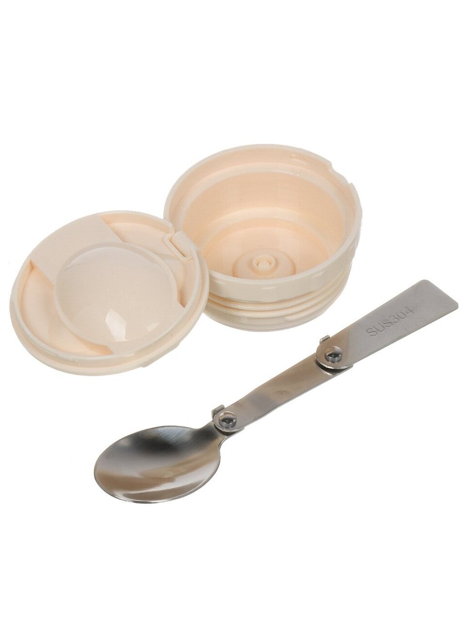 - Уникальное решение: встроенная ложка и широкая горловина — удобно для супов и вторых блюд.