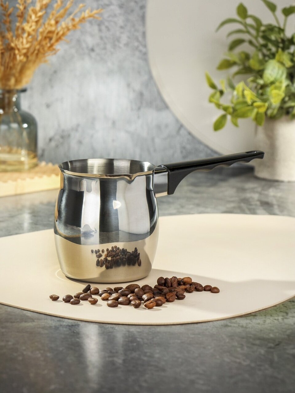 - Удобная форма турки из нержавеющей стали обеспечивает легкое и комфортное использование. Эргономичная ручка обеспечивает безопасный и удобный захват при приготовлении кофе. Благодаря компактным размерам, турка легко поместится даже на самой маленькой кухне.