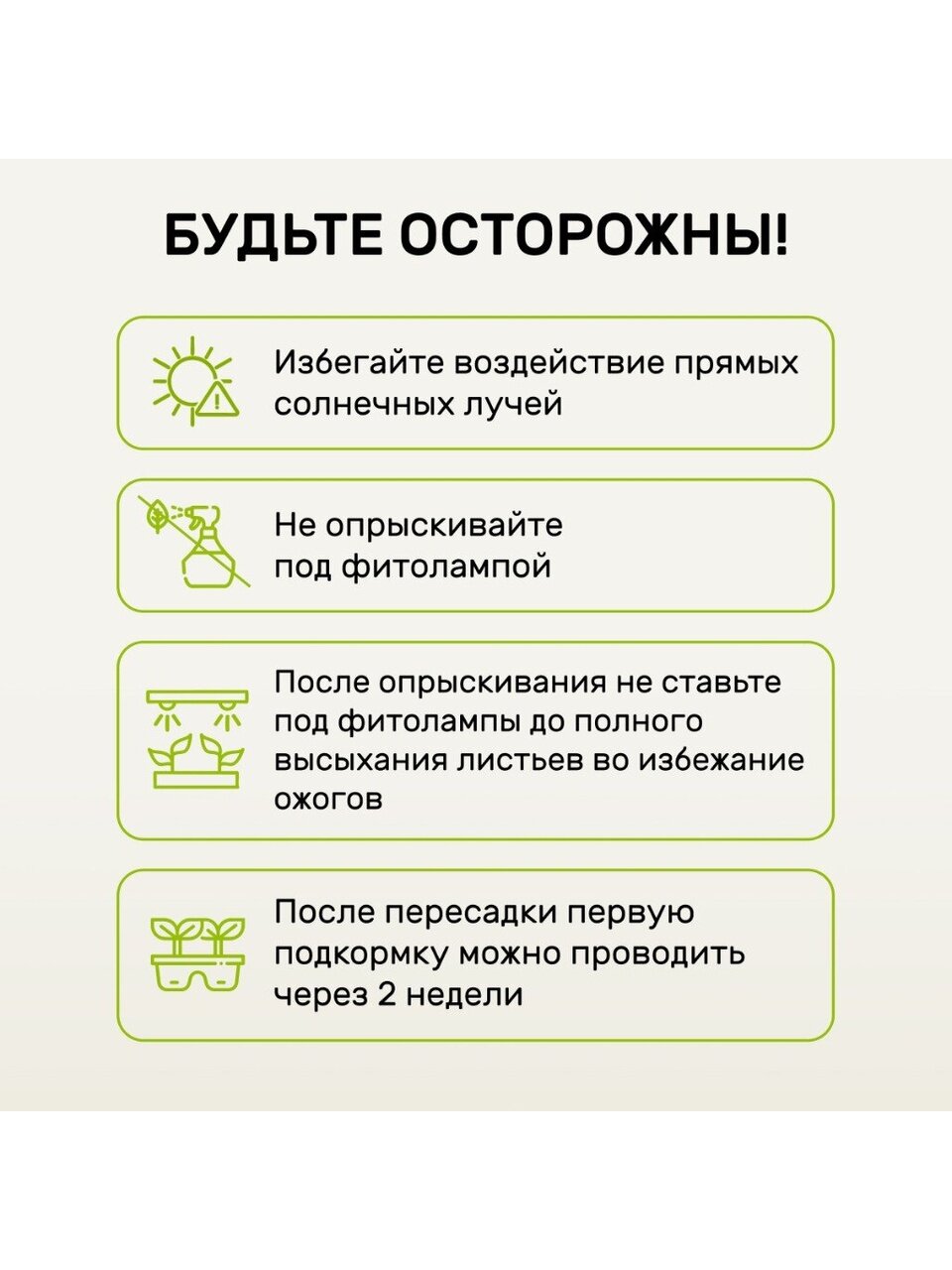 Разведите средство по инструкции (обычно 10-20 мл на 1 л воды), поливайте рассаду 1 раз в 7-10 дней. Подходит для всех видов рассады, в том числе овощей и цветов.