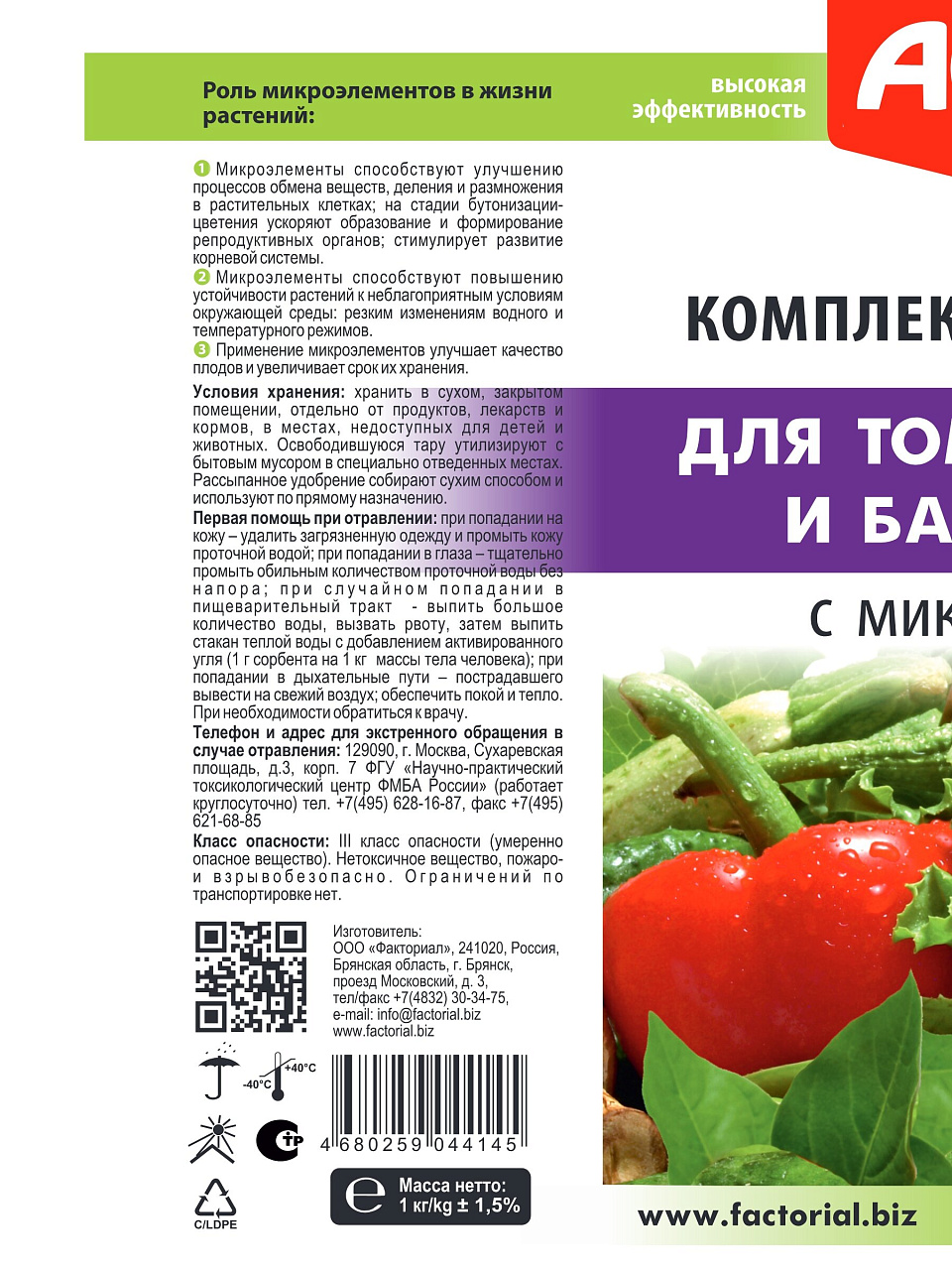В упаковке 1 кг гранулированного минерального удобрения. Подходит для томатов, перцев, баклажанов — для теплиц, открытого грунта и домашних мини-огородов.