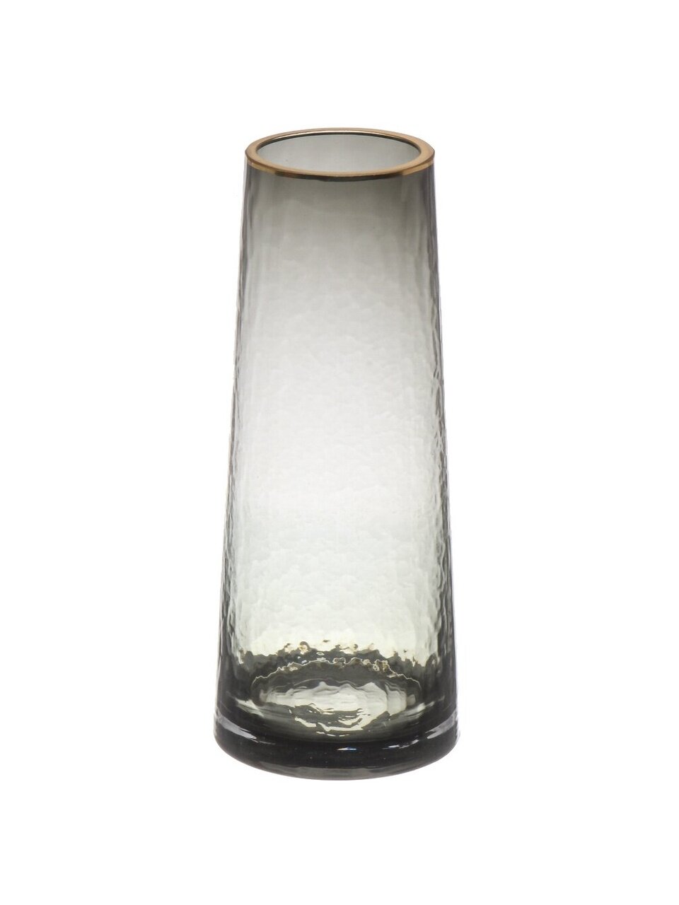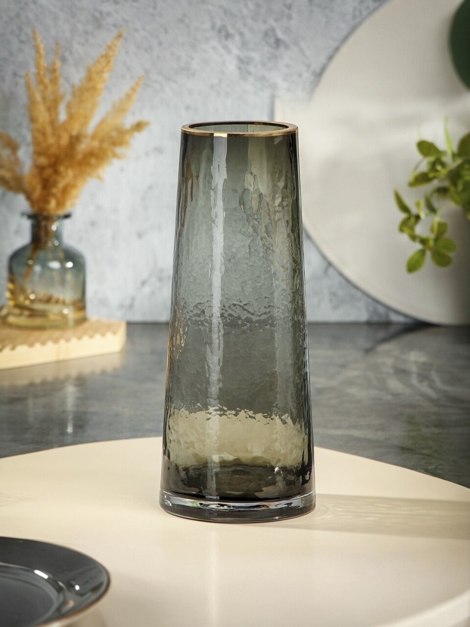 Высокая ваза высотой 25,5 см и диаметром 8 см идеально подходит для больших букетов, позволяя создать выразительные цветочные композиции, которые привлекут внимание и создадут атмосферу уюта и гармонии. Стеклянный материал в графитовом оттенке придает вазе изысканную прозрачность, а золотая отводка добавляет изящества и блеска, подчеркивая ее уникальность и стиль.