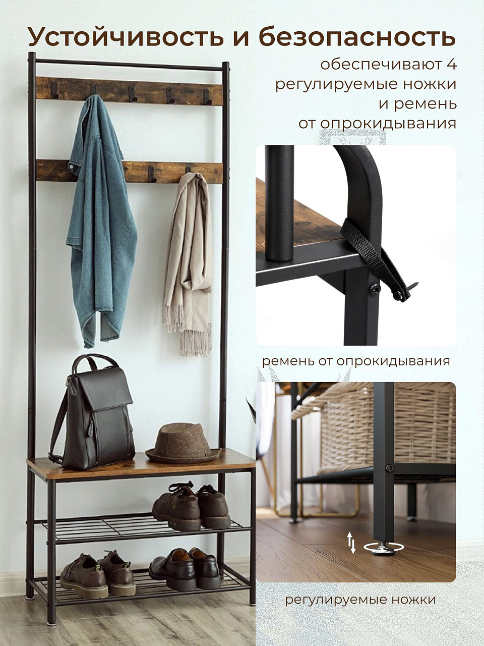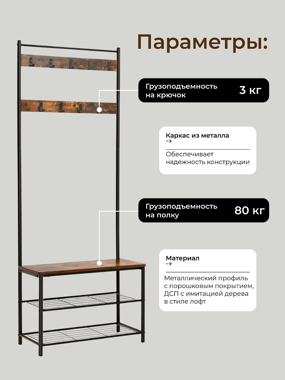 Вешалка рассчитана на максимальную нагрузку до 80 кг, что позволяет размещать зимние куртки, пальто, обувь и аксессуары без риска деформации. Металлическая конструкция устойчива к тяжелым вещам.
