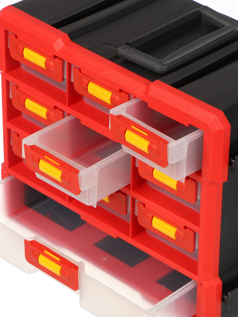 Размер органайзера — 30х25х16 см, всего 10 лотков для удобной сортировки инструментов и комплектующих.