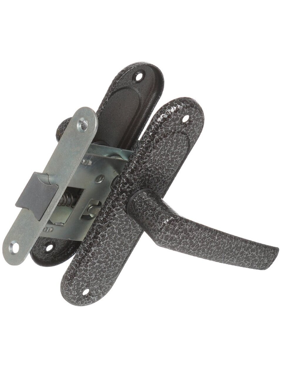 Комплектность: защелка врезная, планка запорная, шуруп (4х25), стержень, ручки фалевые.
